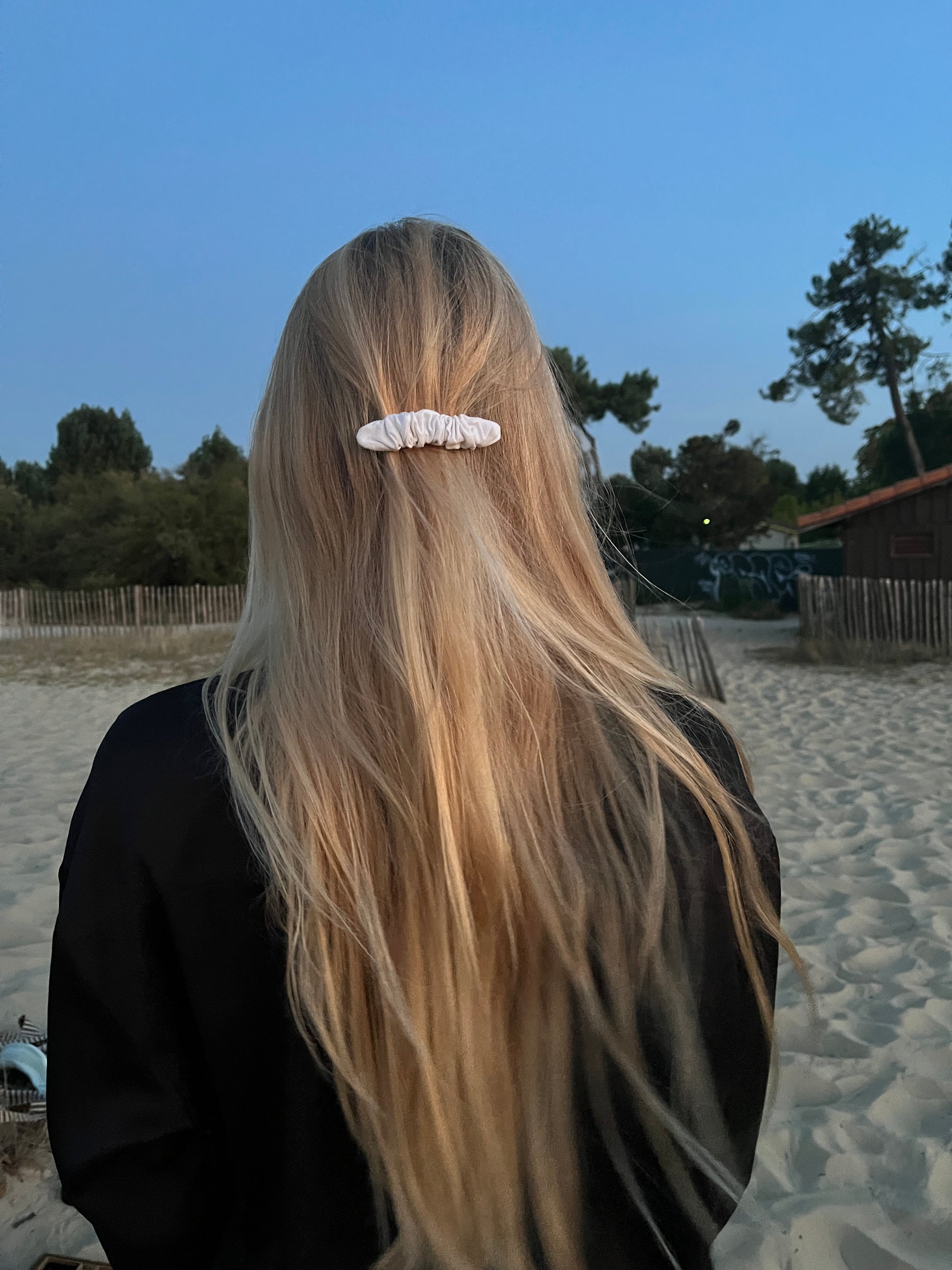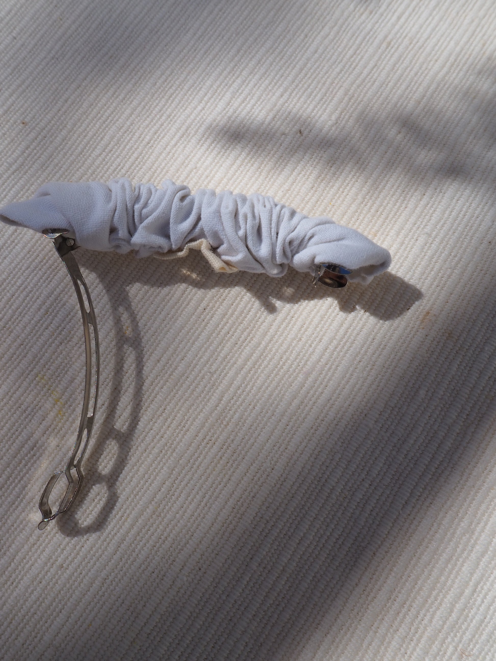 La barrette plissée permet d’attacher vos cheveux avec élégance sans pour autant utiliser un chouchou. Elle permet de clipser une belle masse de cheveux et tient également sur cheveux fins. Fabriquée en métal rhodié, la structure est conçue exprès pour durer dans le temps et ne pas rouiller. Le tissu provient d'un draps chiné en recyclerie.